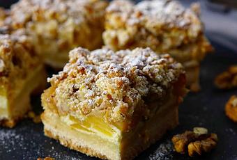 Laissez complétement refroidir avant de découper des carrés ( le crumble peut tomber un peu à la découpe ) Saupoudrez de sucre glace.