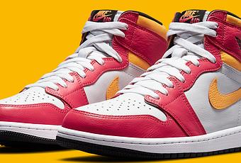 Ici, on retrouve la tige en cuir traditionnelle de la Air Jordan 1 High, teintée d’un coloris tricolore, hors des standards de la marque. Un rouge rosé, un jaune moutarde et des panels blancs s’entremêlent à merveille sur la silhouette, disposant d’un dégradé rouge / jaune sur la languette et de Wings teintées de noir.