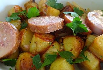 Verser la cancoillotte réchauffée sur les pommes de terre et la saucisse