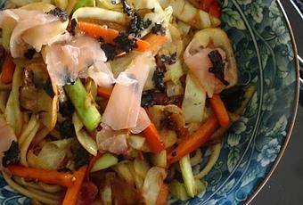 Quand ma sœur avait publié sur son blog, j'ai eu tout de suite envie de la préparer aussi. Il faut savoir qu'a l'origine nous avions créé nos blogs pour échanger nos recettes, sans savoir que nous allions avoir par la suite d'autres lecteurs. Un bel élément accessoire ! Le comble c'est que j'avais tous les ingrédients pour cette recette japonaise à la maison et dont je voulais justement finir certains. J'ai triché un peu sur le gingembre qui devait être rouge et mariné (beni shoga) et que j'ai remplacé par du gingembre rose mariné dont il me restait un peu au fond du frigidaire. Je crois que le rouge est plus salé. On ne va quand-même pas pinailler. Ah oui, j'ai utilisé d'autres pâtes japonaises que celles de Nami. Ces pâtes précuites emballées sous vide que j'avais déjà vues dans le cette recette magasin de produits du monde , ne m'ont jamais inspirée. J'ai donc pris des pâtes udon. Et je n'allais quand-même pas sortir pour acheter 3 champignons shitakes ou utiliser mes shitakes séchés tandis que j'avais de beaux champignons de Paris au frigo. Je n'avais pas de nori en poudre, j'ai donc écrasé une demie feuille de nori en poudre. La sauce yakisoba se vend toute prête, mais on peut aussi bien la préparer soi-même si on a tous les ingrédients.
