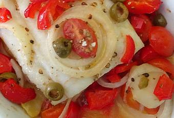 Dans un grand plat adapté au four, alternez les couches de tomates, pommes de terre, morue, rondelles d'oignons et morceaux de poivrons