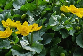 Caltha palustris (Populage des marais) : herbacée vivace à tiges cylindriques creuses ; grandes feuilles simples ovales profondément incisées ; fleurs à tépales jaunes, follicules soudés à la base.