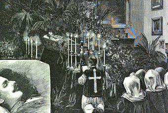 D'après la légende de ce dessin de Karl Trill pour le magazine Über Land und Meer, la chapelle ardente de l'archiduc aurait été aménagée dans la chambre à coucher de l'empereur François. Rodolphe. Les textes de Mayerling.
