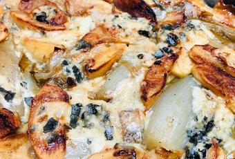 Endives braisées, pommes sautées, gratinées au bleu d’Auvergne