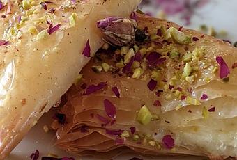 A l’approche du ramadan, je vous propose une spécialité orientale, version palestinienne de Sami Tamimi : Un triangle feuilleté à base de pâte à filo, garni traditionnellement d’Ishta, une sorte de crème épaisse et arrosé de sirop de rose.L’Ishta n'étant pas toujours facile à trouver, l’auteur l’a remplacée par une garniture au creamcheese.Cette pâtisserie est très facile à préparer. Les triangles de 12cm/12 sont grands et généreux.Ces triangles sont délicieux. Le moelleux du fromage, le croustillant de la pâte et la douceur du miel à la rose forment un mariage harmonieux en saveurs.Je n’ai réalisé que la moitié des feuilletés car ils sont à consommer le jour-même sinon la pâte perd son croustillant. En effet, la garniture au fromage va humidifier la pâte qui va perdre progressivement son croustillant.Il y a quelques années, j'ai proposé les mêmes feuilletés, version syrienne, garnis de fruits secs. Ceux-là gardent leur croustillant plusieurs jours de suite (voir ici)