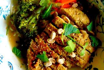 Le seitan en question (on amalgame ce qui suit, on pétrit, on sépare en 4, on fait doucement mijoter dans du bouillon de champignons pendant une petite heure, on refroidit) passé à la poêle;
