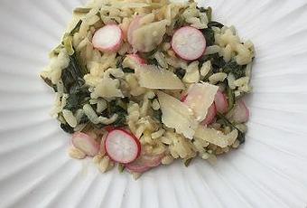 Avec le printemps, les petits radis roses arrivent sur les étal. Il serait dommage de jeter leur fanes. Si elles sont excellentes en soupe, elles conviennent parfaitement au risotto. Bien sûr, il faut bien les laver comme les légumes ou les épluchures!