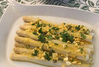 -10 belles asperges blanches -2 œufs -1 cc de moutarde de Dijon -2 cs de vinaigre balsamique blanc -2 cs de vin de Xérès -6 cs d'huile d'olive -1 cs de câpres -1 branche de persil -1 branche de coriandre -sel, poivreEplucher les asperges avec un économe et les cuire à l eau bouillante salée. Le temps de cuisson dépend de leur grosseur, vérifier la cuisson à l aide de la pointe d'un couteau. Compter environ 7 à 10 minutes. Egoutter et garder à température ambiante.