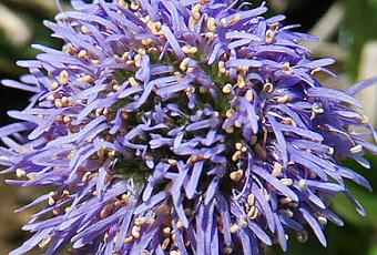 Globularia bisnagarica (Globulaire) : herbacée vivace ; tige dressée ; rosette de grandes feuilles basilaires longuement pétiolées et spatulées, petites feuilles caulinaires alternes, sessiles, elliptiques ; inflorescence en capitule globuleux terminal, petites fleurs bleues à symétrie bilatérale.