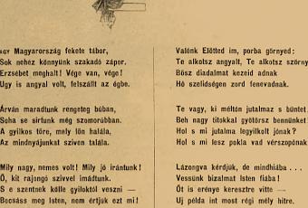 A hitben ég csak vigasz sugára,Síró magyarság, bazdulj imára! ...Zug ma a tornyok minden harangjaS hallgat a írófa kaczagó hangja.