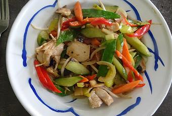 Mon invité du mercredi aime beaucoup la cuisine chinoise et indonésienne et j'ai donc préparé un de ses plats préférés le tjap tjoy qu'on appelle aussi chop suey ou chop choy. Avec ce plat on dépasse largement les 5 légumes qu'on nous recommande de manger par jour. On peut le préparer avec du poulet ou avec des crevettes ou du tofu pour les végétariens.