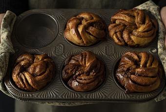 Sur un plan de travail légèrement fariné , déposez la pâte , donnez des petits coups à l'aide du poing pour la dégonfler . Étalez votre pâte en un rectangle de 40 cm de large sur 50 cm de long . Mélangez dans un bol le beurre mou , le sucre et la cannelle pour obtenir une pâte épaisse . Étalez sur les 2/3 de la surface de la pâte à l'aide d'un couteau et laissez 1/3 vers le haut sans garniture.Repliez la partie haute vers le milieu puis repliez la partie basse vers le milieu.Coupez la pâte en 12 tronçons ( n'hésitez pas à recouper les bords si le pliage n'est pas complètement bord à bord ). Coupez chaque tronçon en 3 en laissant 0,3 à 0,5 cm non coupé pour s'en servir de base.Tressez les 3 morceaux de pâte , rentrez la base en dessous et posez dans un moule à muffin .Cela va permettre à la brioche de gonfler sans trop se déformer. Laissez gonfler 30 minutes .