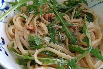Servir les pâtes et garnir avec les noix, la menthe et la roquette.