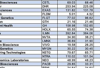 L’indice a surperformé le Dow Jones Industrial Average et le Nasdaq Biotechnology Index, qui ont tous deux augmenté de près de 3% en avril. Cependant, l’indice a moins bien fait que le Nasdaq, qui a augmenté de 5% le mois dernier. La performance des actions individuelles de l’indice GenomeWeb a été largement positive le mois dernier, 25 des 36 actions ayant enregistré des gains et 11 pertes.