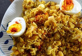 Mélanger le riz cuit, le poisson, le persil, la moitié des œufs, le sel et le poivre
