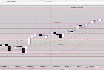 Après une brève pause au-dessus du support des 6162 points, le CAC 40 est reparti de l'avant en enregistrant une belle hausse de 1,85% pour la 1ère semaine de mai.La bougie blanche formée en l'occasion est de taille moyenne mais permet surtout une clôture au-dessus de la pointe de l'ombre haute de la bougie précédente.Ce graphe des bougies hebdomadaires montre que rien ne s'oppose désormais à ce que le marché progresse vers son sommet historique de 2000 (6945 points)Je n'ai pas représenté les différentes résistances que le CAC 40 trouvera sur son chemin (peu nombreuses cela dit); il faut cependant noter que la plus importante est toute proche, située sur les 6453 points.Nous verrons rapidement comment le marché se comportera à son contact. Même en cas de nouvelles hésitations en chemin, il faut s'attendre à reparler de l'évènement "sommet historique" du CAC 40 à venir!