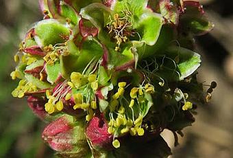 Poterium sanguisorba (Sanguisorbe pimprenelle, petite pimprenelle) : herbacée vivace à tige dressée ; feuilles basales composées pennées à 4-12 paires de folioles ovales dentées ; inflorescence terminale subglobuleuse dense ; fleurs à tépales verdâtres, mâles à longues étamines jaunes, femelles à stigmates rouges.