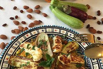 -1 paquet de semoule -1 paquet fruits secs et d'épices spécial tajine -1 oignon -2 mini courgettes -2 mini aubergines -1 paquet d'Halloumi -Quelques feuilles de menthe -3 cs d'huile d'oliveCouper les courgettes et les aubergines en tranches.