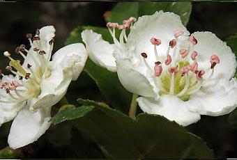 Crataegus laevigata (Aubépine à deux styles) : arbuste très ramifié, épineux : feuilles alternes ovales, non ou discrètement lobées ; fleurs blanches à 5 pétales, 2(3) styles ; drupes ovoïdes rouges à 2(3) noyaux.