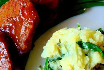 On sert avec la "sauce brune" de notre choix, des patates pilées (ici cuites avec du kale), des haricots verts cuits à l'eau puis passée à la poêle avec un peu d'huile d'olive, de l'ail, du jus de citron et du poivre