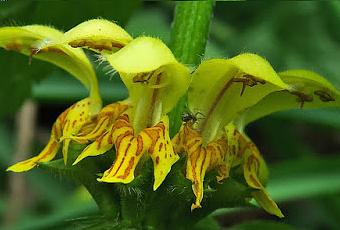 Lamium galeobdolon (Lamier jaune, ortie jaune) : espèce sciaphile des forêts mélangées à feuilles vertes (subsp. montanum) ou marbrées de blanc grisâtre (subsp. argentatum).