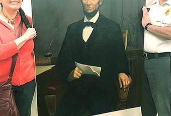 Eileen Mayhew, à gauche, et Brian Sullivan, chef de la police / administrateur par intérim de la ville, avec le portrait d’Abraham Lincoln par Mayhew. Le portrait est une réplique de celui volé en 1994 à l’hôtel de ville de Norwich, dans le Connecticut (photo Breeze de Nicole Dotzenrod)
