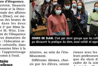 "Slam à l'école" est un dispositif qui s'adresse aux élèves de cycle 3 et 4 (du CM2 à la troisième) avec une extension probable aux lycées. Voir : https://eduscol.education.fr/1399/slam-l-ecole Il s'agit d'un minimum de 6 séances de 2 heures avec une même classe, qui peut s'achever (sans obligation toutefois) par les "Trophées Slam à l'école", qui ont lieu tous les ans sur Paris, avec une invitation pour 5 jeunes à venir se produire dans un théâtre, en compagnie de Grand corp malade et de Marc Smith, poète américain à l'origine du mouvement Slam. Entre poésie et performance, le Slam donne à chacun la possibilité de monter sur scène pour présenter sa production poétique, sans accessoire ni costume, avec pour seule évaluation la réaction du public
