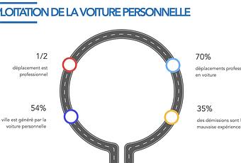Aujourd’hui, la voiture personnelle reste le moyen de transport privilégié des salariés. 70% des déplacements professionnels se font en voiture et 1 déplacement en voiture sur 2 est professionnel.