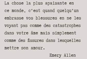 La chose la plus apaisante en ce monde, c'est quand quelqu'un embrasse vos blessures en ne les voyant pas comme des catastrophes dans votre âme mais simplement comme des fissures dans lesquelles mettre son amour. - Emery Allen