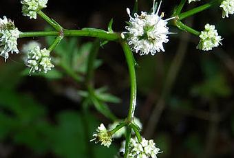 Sanicula europaea (Sanicle) : herbacée vivace ; tige dressée striée ; rosette basilaire de feuilles palmées, profondément divisées en 3-5 segments, à long pétiole, 1-2 feuilles caulinaires subsessiles ; ombelle à 3-5 rayons inégaux de fleurs blanc-rosé, involucre à 2-4 petites bractées découpées.