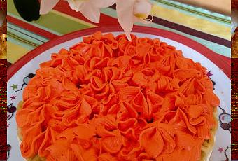 Avant de servir, monter un peu de crème fraîche en chantilly colorée en orange et pochée des fleurs sur le gâteau démoulé sur un plat. Personnellement, j'ai opté pour une version renversée.