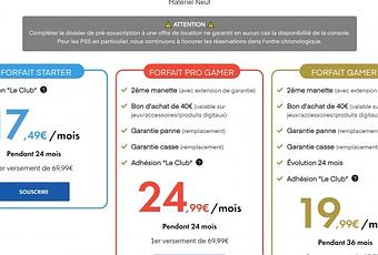 L'idée pourrait sembler intéressante de louer sa console de jeu tous les mois pour éviter de sortir plusieurs centaines d'euros. Pourtant ce n'est pas le cas, on est sur un service de location et non d'acquisition comme le propose Xbox. De plus si on prend une console comme la Nintendo Switch avec le forfait Starter à 17.49 euros par mois durant 18 mois avec un 1er versement de 44€99, on se retrouve alors à payer la somme de 360€ par mois. Le constat est sans appelle, on paie la console 300€ neuve alors qu'en location on paie plus chère, ce n'est pas intéressant surtout qu'en plus dans le starter pack, il semble que la console ne soit pas assurée ! Je ne parle même pas de la Playstation 5 où on atteint les 800€ mais c'est clairement abusé et je me refuse donc d'en faire la publicité.