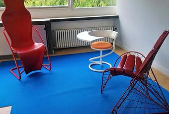 En temps normal, il n'y a aucun mobilier dans la villa Savoye. Mais actuellement, et ce jusqu'au 26 septembre 2021, y a lieu l'exposition "Sièges modernes. Le Mobilier national invité à la villa Savoye." Dans les pièces de la maison, sont installés une vingtaine de sièges contemporains issus des collections du Mobilier national et conçus par l'Atelier de Recherche et de Création (ARC). Des pièces très bien mises en valeur par l'espace, et la luminosité du lieu.