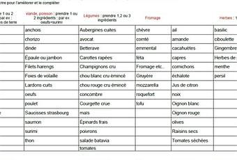 Alors j’ai fait un tableau : un générateur de salades afin de m’aider à les varier, je m’en sers aussi pour les taboulés!!