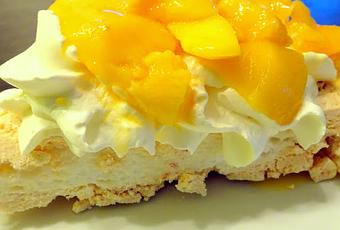 Garnir la meringue avec la crème moelleuse et les cubes de mangue et/ou la pulpe des fruits de la passion.