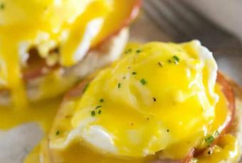 Déposez une tranche de bacon grillée sur chaque pain, en dessus un œuf poché puis nappez le tout avec 2 c.à.s de sauce hollandaise.