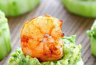 Placez les rondelles de concombre sur un plat, puis étalez 1 c.à.c d'avocat écrasé en dessus et placez en dessus une crevette grillée.
