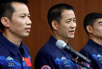 Les astronautes chinois Nie Haisheng, Liu Boming et Tang Hongbo prennent la parole lors d’une conférence de presse au Jiuquan Satellite Launch Center près de Jiuquan, dans la province du Gansu. Carlos Garcia Rawlins/Reuters