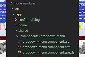 Le “cg” est l’abréviation de “Generate Component”, donc, tant que vous savez ce que vous tapez, c’est bien d’utiliser la forme courte. La commande ci-dessus placera notre nouveau composant de menu déroulant sous « srcappsharedcomponentsmenu déroulant”: