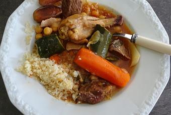 J'ai profité de la venue de mon invité du mercredi pour préparer un couscous, je sais qu'il aime beaucoup et moi j'en avais envie aussi. Je ne le prépare pas exactement comme indiqué dans les livres de cuisine, car je fais revenir les légumes avant de les ajouter au bouillon pour leur donner plus de goût. Les puristes ne seront peut-être pas d'accord, mais la cuisine permet à chacun d'arranger les recettes à ses goûts. Le couscous est un plat du Maghreb et en tant que néerlandaise d'origine, française par mariage et catalane d'adoption j'ai appris cette recette par ma belle-mère pied noir et que j'ai adaptée ensuite à mes goûts.