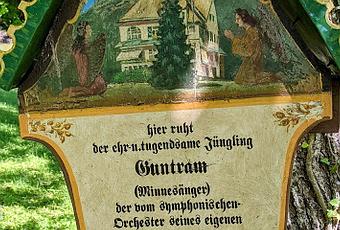 (Ici repose Guntam (Minnesänger), un jeune homme honorable et vertueux, qui fut assassiné par l'orchestre symphonique par l'orchestre symphonique de son propre père. Qu'il repose en paix !)L'on raconte que le père de Guntram aurait enterré à cet endroit quelques pages de la partition de son opéra. Mais ses descendants assurent, m'a-t-on confié, affirment qu'il n'en est rien.