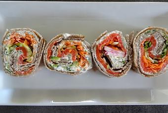 Mélanger le fromage frais avec l'aneth hachée et le jus de citronEtaler le fromage frais sur 4 galettes, puis ajouter 2 tranches de saumon fuméDisposer les légumes sur le dessus, puis rouler les makis en les serrant bien