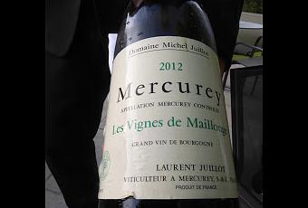 apéritif, pour commencer doucement, nous avons innové avec un Mercurey, les Vignes de Maillonges 2012, domaine Michel Juillot : un nez très floral, fin, dégageant