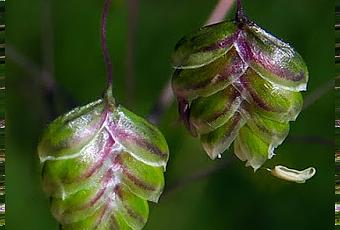 Briza media (Amourette commune, tremblante) : herbacée vivace à souche rampante ; tige dressée ; ligule arrondie ou tronquée ; épillets ovales à suborbiculaires très souvent violacés.
