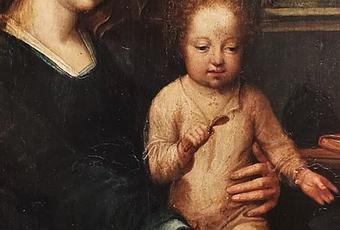 Maître du Papagayo. La sainte Famille. Bellas Artes, Séville. Ou, comment détourner l'enfant encore attaché à son enveloppe charnelle (lait), et le diriger vers son destin de porteur du savoir divin (vigne).