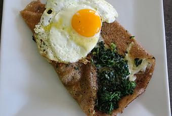 Cette fois-ci j'ai cherché de l'inspiration dans mon livre de cuisine :"Breitz Café" de Bernard Larcher. Je ne prépare pas les galettes de sarrasin à partir d'une pâte faite maison, parfois je me la coule douce et je les achète toutes faites au supermarché. Et pour les épinards j'ai utilisé des épinards congelés, mais je vous donne ci-dessous la recette complète du chef.