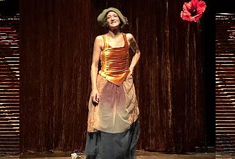 Elle surgit de derrière le rideau dans le costume (magnifiquement décadent et poétique) de Dolores Alvez Bruzat en susurrant un « Il parait … » que l’on pressent lourd de sous-entendus. Elle nous transmet, un peu plus d’une heure durant ses envolées lyriques, son questionnement et ses réflexions philosophiques à propos de l’origine du monde, de la santé et de la conquête de l’Amérique sans jamais perdre les pétales des enchaînements poético-lexico-absurdo-drôlatiques et néanmoins pertinents à la manière d’une reine de Motordu.