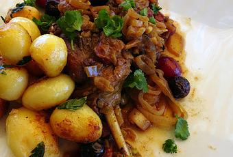 Un tajine désigne tout autant un plat de cuisson et de service, large et peu profond surmonté d'un couvercle conique en terre cuite parfois vernissé qu'une préparation culinaire cuite dans cet ustensile. Il en est de même pour la cataplana portugaise. Le tajine est préparé dans les pays du nord de l'Afrique. J'ignore de quel pays vient cette recette, peut-être tout simplement de France puisqu'elle est préparée avec du confit de canard. En plus moi je l'accompagne de pommes de terre rissolées ce qui ne me semble pas une préparation du Maghreb. Et pour compléter le tout j'ajoute une vidéo filmée en Ethiopie. Un melting pot de cultures, comme j'aime.
