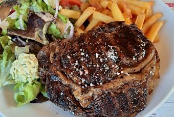 La Cassolette de légumes façon crumble est riche, le Croque-Monsieur fait maison est servi avec frites et salade, au même titre que l’Entrecôte de bœuf (300g) avec un beurre maitre d’hôtel. La Crème brulée a le mérite d’être « maison » mais malheureusement sous-cuite. Mais ne soyons pas trop exigeant, l’ensemble est bien servi, plaisant, et nourrissant. On ne se moque pas du client et le service est aussi aimable qu’efficace. Courte et intéressante sélection de vins axée sur le local avec une petite incursion dans le bordelais…