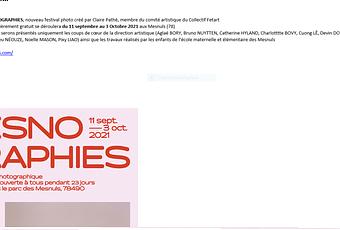 Un nouveau Festival Photos « MesnoGRAPHIES 11/09 au 03/10/2021 Un nouveau Festival Photos « MesnoGRAPHIES 11/09 au 03/10/2021 Explore posts in the same categories: photographies